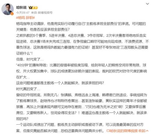 不希望楊鳴指導離職,他應(yīng)該帶10多年才好,他已經(jīng)證明過自己的實力,有好陣容就可以奪冠。