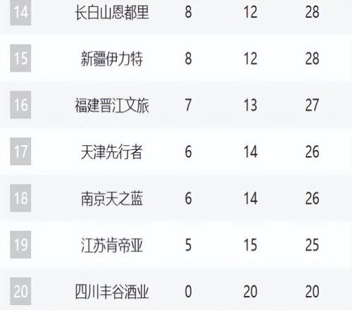 14-20分別是吉林、新疆、福建、天津、同曦、江蘇和四川。吉林、福建和新疆這輪全部都輸球了,特別是新疆好不容易崛起,這輪卻最后時刻崩盤輸給同曦。至于吉林和福建,相比于賽季初期,他們的排名還在持續(xù)下滑。天津現(xiàn)在已經(jīng)三連敗,同曦即便這輪取勝,但他們目前也就6勝,他們的狀態(tài)需要鞏固住。江蘇最近狀態(tài)非常好,10場贏了4場,可惜這輪輸給了浙江。四川已經(jīng)20連敗。