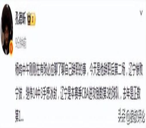楊鳴中午剛剛在有球必應(yīng)聊了聊自己辭職的事,今天是他辭職后第二場,遼寧慘敗寧波,繼偉14中3手感冰封,遼寧是本賽季CBA進攻倒數(shù)第3的球隊,去年是正數(shù)第1。