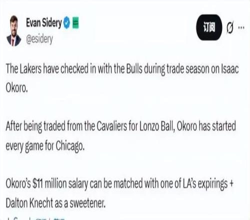 奧科羅則是更加靠譜的選擇,美記Evan Sidery此前也曝出湖人已經(jīng)向公牛隊詢價,希望圍繞克內(nèi)克特+到期合同作為核心籌碼追求奧科羅。