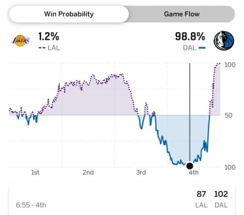 從本場(chǎng)的獲勝概率走勢(shì)圖上你也能看出來劇情有多么炸裂,湖人前兩節(jié)半都是更可能獲勝的一方,結(jié)果第三節(jié)過半情況急轉(zhuǎn)直下,落后最多時(shí),湖人的獲勝概率僅為1.2%,但他們依然完成了這1.2%的奇跡。
