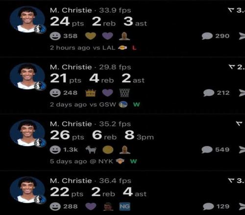 全場比賽克里斯蒂出戰(zhàn)35分鐘,得到24分2籃板3助攻,高居本場比賽的隊內得分王。再往前三場比賽,克里斯蒂的得分分別是21分、26分、22分。