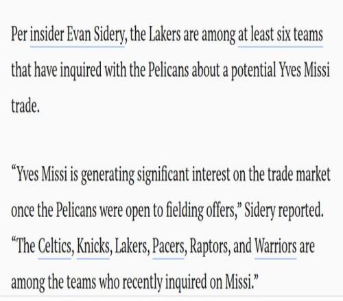 名記Sidery表示,湖人隊(duì)是已向鵜鶘隊(duì)詢價(jià)米西的至少六支球隊(duì)之一。