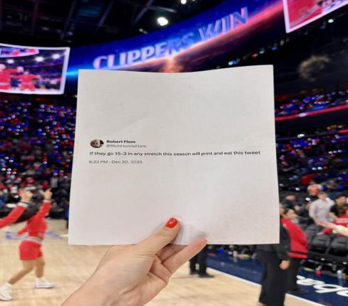 值得留意的是,此前有球迷在個人社交媒體聲稱,若快船能在本賽季任意階段獲得15勝3負的戰(zhàn)績,他會將這條推文打印出來吃掉。而在本場比賽結(jié)束后,這名球迷也在第一時間發(fā)推表示,自己將會直播履行承諾。