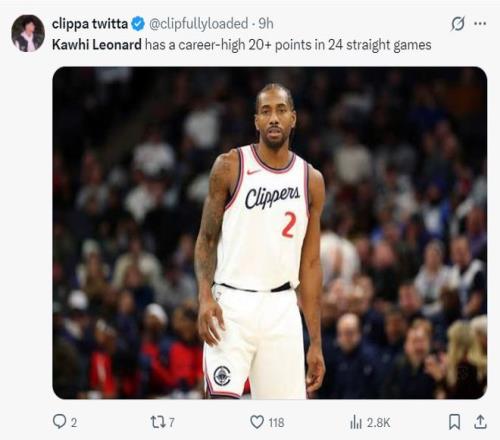 快船18戰(zhàn)15勝!小卡場均32.1分聯(lián)盟封王連續(xù)24場20+創(chuàng)生涯新高
