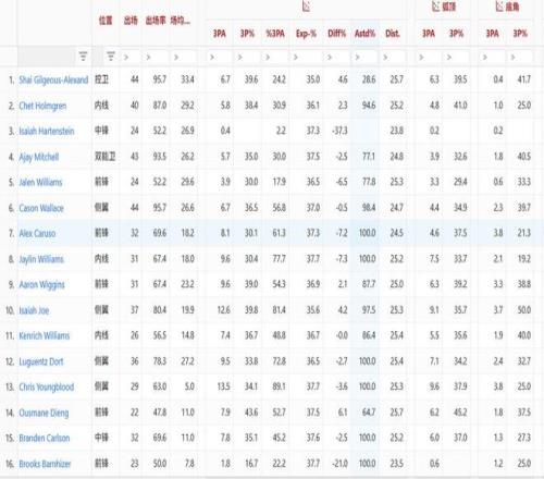 雷霆全隊(duì)16人除了亞歷山大三分受助攻率不足30%外,其余人都在60%以上,幾位首發(fā)受助攻率更是飆到77%以上。從這一點(diǎn)可以看出,雷霆進(jìn)攻真正有威脅的點(diǎn)只有亞歷山大,其他人都是他的掛件幫他拉進(jìn)攻空間。反觀73勝勇士,庫里只是一個相對有把握的得分終結(jié)點(diǎn)。湯普森、伊戈達(dá)拉甚至巴恩斯都能自主持球單打且每回合能拿到0.9分,雖然算不上精英持球攻擊手但具備個人進(jìn)攻威脅。而雷霆除了亞歷山大其他人不僅沒特別強(qiáng)持球進(jìn)攻威脅,也沒有足夠強(qiáng)的單打欲望。這也是雷霆和73勝勇士進(jìn)攻端最大差別。