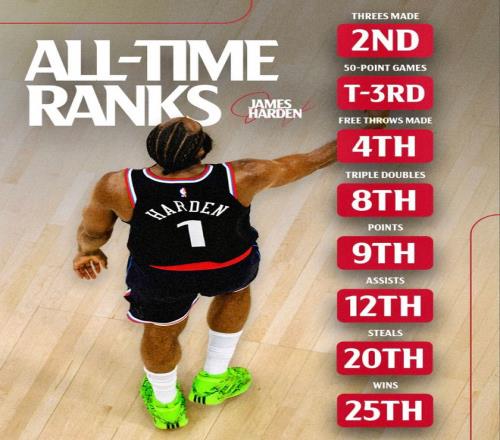 快船官方曬出哈登八項(xiàng)歷史數(shù)據(jù):三分球第二、50+第三、罰球命中數(shù)第四、三雙第八、得分第九、助攻第十二、搶斷第20、勝場(chǎng)數(shù)25。