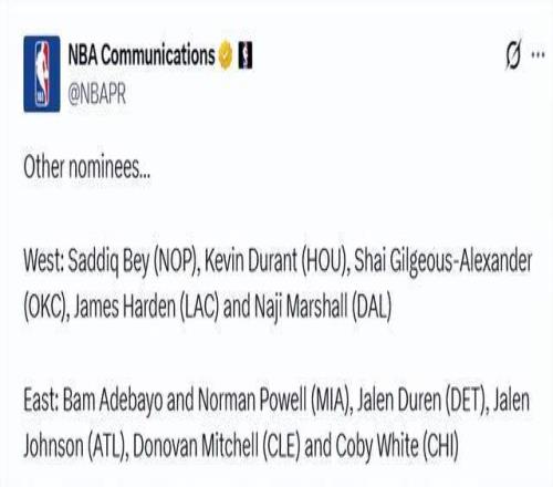 西部:薩迪克-貝(鵜鶘)、杜蘭特(火箭)、亞歷山大(雷霆)、哈登(快船)、馬紹爾(獨(dú)行俠)