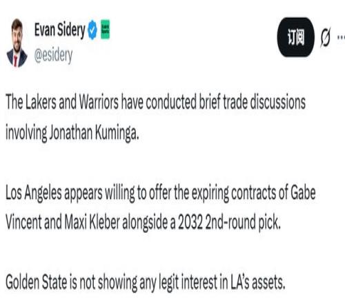 北京時間1月27日,名記Sidery報道,湖人和勇士近期圍繞庫明加展開了簡短的交易談判。勇士隊已在私下明確表態(tài):對...