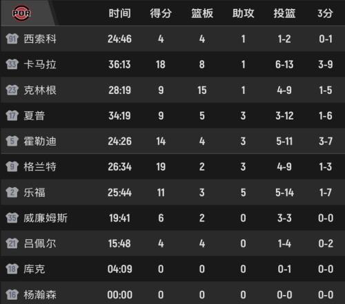夏普、樂福的投籃效率均為7中1,斯普利特就是不給楊瀚森機會,呂佩爾都打了7分多鐘,小楊枯坐板凳。第三節(jié)開拓者一度落后20分,之后開拓者不斷在籃下造犯規(guī),卡馬拉命中2記關(guān)鍵三分,當(dāng)樂福在反擊中上籃命中,開拓者追至56-66,打停凱爾特人。布朗造成殺傷罰球2進1,夏普拉桿上籃打板命中,差9分了。凱爾特人的謝爾曼補籃得手,格蘭特上罰球線2罰都進。