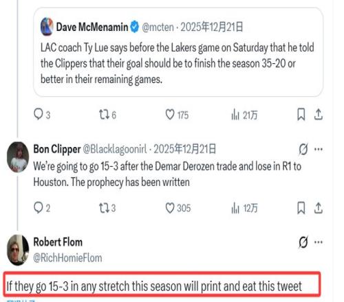 這件事的起因還要追溯到一個(gè)多月前,快船主帥泰倫-盧曾在12月21日表示,他向球隊(duì)提出了剩余賽程拿下35勝20負(fù)的目標(biāo)。彼時(shí),快船的戰(zhàn)績(jī)僅為6勝21負(fù)。弗洛姆當(dāng)時(shí)在社媒上回應(yīng)盧的這一目標(biāo)時(shí)寫道:“如果快船本賽季能打出一波15勝3負(fù)的戰(zhàn)績(jī),我就把這條推文打印出來(lái)吃掉。”