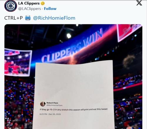 快船對(duì)陣籃網(wǎng)的比賽時(shí),不少球迷紛紛想起了弗洛姆的這條推文。快船隊(duì)官方也記著這件事,終場(chǎng)哨聲一響,球隊(duì)便立刻在社媒上發(fā)文回應(yīng),并附上了一張?jiān)谟⒏駹栁榈麦w育館內(nèi)拍攝的推文打印稿照片。