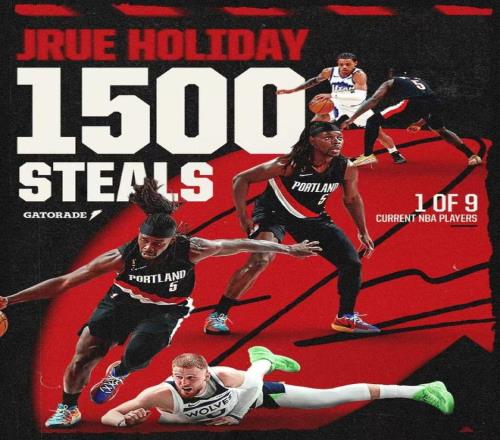 霍勒迪達(dá)成生涯1500次搶斷里程碑,成為現(xiàn)役第9人。