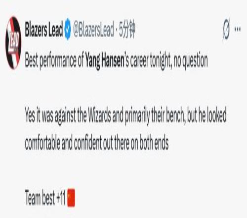賽后,楊瀚森的表現(xiàn)也引起熱議。開(kāi)拓者媒體BlazersLead寫(xiě)道:“毫無(wú)疑問(wèn),這是楊瀚森職業(yè)生涯至今最出色的一場(chǎng)表現(xiàn)!沒(méi)錯(cuò),對(duì)手是奇才隊(duì),而且面對(duì)的大多是他們的替補(bǔ)陣容,但他在攻防兩端都打得從容自信。正負(fù)值 + 11,全隊(duì)最高?!?/p>