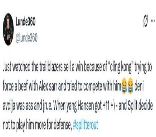 球迷lunde360寫(xiě)道:“剛看完比賽,開(kāi)拓者簡(jiǎn)直是把勝利‘送’出去了!克林根和薩爾較勁,還想硬拼。阿夫迪亞和霍勒迪打得像坨屎。楊瀚森正負(fù)值都+11了,斯普利特(主教練)卻以防守為理由不讓他多打,#斯普利特下課。”
