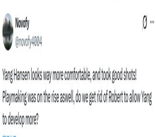 球迷novofy4004表示:“楊瀚森看起來(lái)比之前自在多了,投籃選擇也很明智!他的策應(yīng)能力也在提升,我們是不是該送走羅伯特(威廉姆斯),給楊瀚森更多成長(zhǎng)空間?”