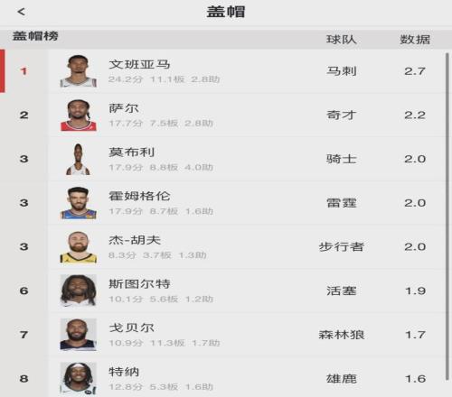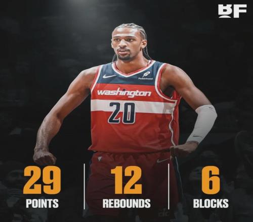 本賽季至今,薩爾為奇才首發(fā)出戰(zhàn)36場(chǎng)比賽,場(chǎng)均出戰(zhàn)28.6分鐘,得到17.7分7.5籃板2.8助攻0.8搶斷2.2蓋帽1.8失誤,三項(xiàng)命中率:49.8%,34.3%,71.2%。薩爾場(chǎng)均蓋帽高居聯(lián)盟第二,僅次于文班亞馬(2.7)。