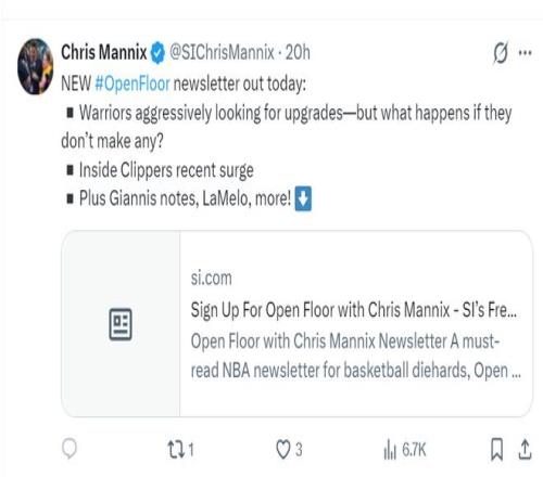 很明顯克里斯-曼尼克斯、尼克-菲爾德都覺得勇士隊(duì)?wèi)?yīng)該放眼下賽季,除非揚(yáng)尼斯真的要被交易,不然勇士隊(duì)在這個交易截止日可以不去引援,勇士還讓有交易價(jià)值的老將送走換取一些有價(jià)值的未來資產(chǎn),在今夏休賽期再進(jìn)行大規(guī)模的交易補(bǔ)強(qiáng),讓庫里26-27賽季有希望去沖冠。