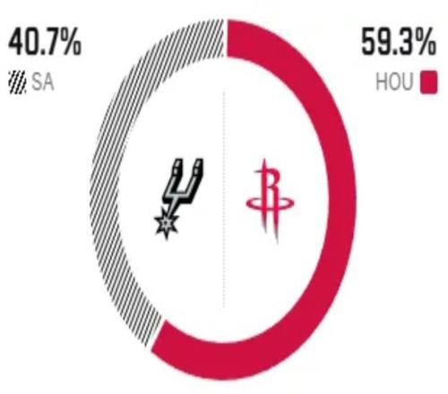 賽前,美媒ESPN對(duì)本場(chǎng)比賽進(jìn)行了勝率預(yù)測(cè),火箭隊(duì)勝率依舊高達(dá)59.3% ,占據(jù)絕對(duì)上風(fēng),馬刺勝率則僅有40.7% 。
