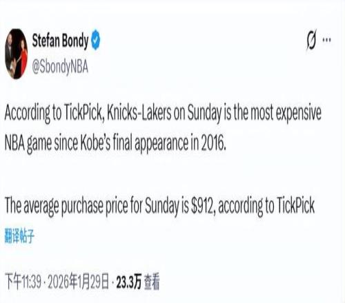 另?yè)?jù)報(bào)道,2月2日,詹姆斯將率領(lǐng)湖人客場(chǎng)挑戰(zhàn)紐約尼克斯,這場(chǎng)比賽或許會(huì)是他職業(yè)生涯最后一次踏上麥迪遜廣場(chǎng)花園的賽場(chǎng)。如果想親臨現(xiàn)場(chǎng)觀戰(zhàn),門票價(jià)格可不便宜。