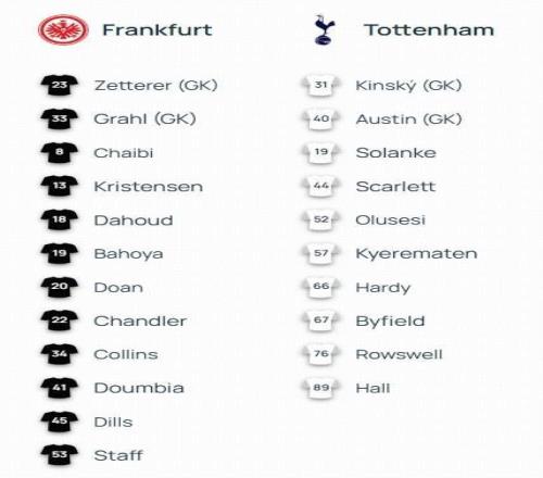 北京時間1月29日04:00,歐冠 聯(lián)賽階段第8輪,法蘭克福主場迎戰(zhàn)托特納姆熱刺,賽前雙方球隊首發(fā)名單公布如下:法蘭克...