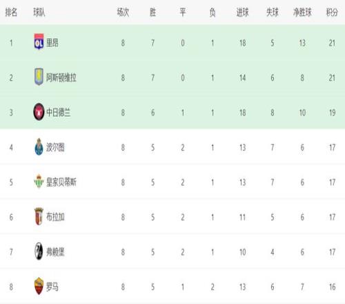 至此,歐聯(lián)杯16強(qiáng)已經(jīng)決出8個(gè)名額,排名前8的球隊(duì)直接晉級(jí),包括:里昂、阿斯頓維拉、中日德蘭、波爾圖、皇家貝蒂斯、布拉加、弗賴堡和羅馬。