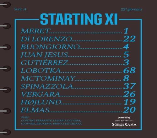 那不勒斯首發(fā):1-梅雷特、5-熱蘇斯、4-布翁焦?fàn)栔Z、22-迪洛倫佐、3-古鐵雷斯、8-麥克托米奈、68-洛博特卡、37-斯皮納佐拉、20-埃爾馬斯、19-霍伊倫、26-韋爾加拉