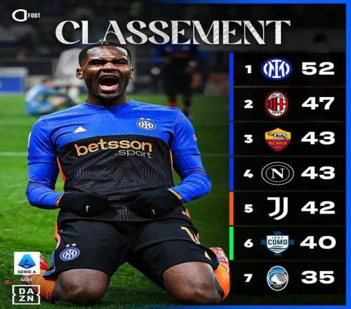 目前的積分榜里,國米以52分排在榜首,擁有5分的優(yōu)勢,米蘭47分排在第二,領先第三名羅馬4分,前三名之間有兩個小的積分斷檔。而從第三名羅馬到第六名科莫之間則只有3分分差,也就是名次每一輪都有可能發(fā)生變化,之后第七名的亞特蘭大距離身前的科莫也有5分的差距。按照目前這個積分形勢解讀,米蘭雙雄應該算是意甲冠軍的最有力爭奪者,而身后的羅馬、那不勒斯、尤文和科莫則要爭奪剩余的兩個前四名額,亞特蘭大表現好也能加入歐戰(zhàn)名額的競爭。