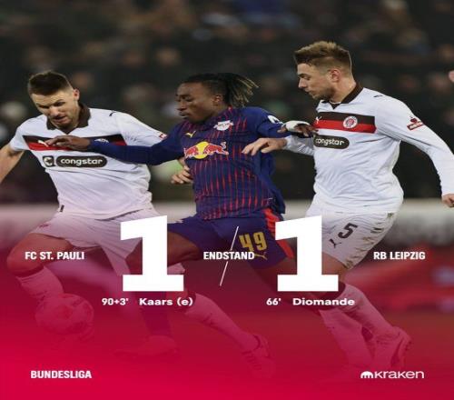 北京時(shí)間1月28日03:30,德甲聯(lián)賽第16輪,圣保利在主場米勒門球場迎戰(zhàn)RB萊比錫。上半場雙方均無建樹,半場0-0結(jié)束。易邊再戰(zhàn),第66分鐘,揚(yáng)-迪奧曼德破門為RB萊比錫取得領(lǐng)先;補(bǔ)時(shí)階段,勞姆送點(diǎn),卡爾斯主罰點(diǎn)球命中,幫助圣保利扳平比分。最終雙方1比1戰(zhàn)平。