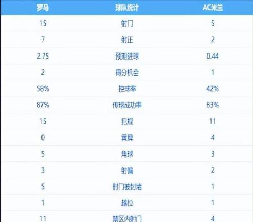 羅馬隊(duì)在多項(xiàng)數(shù)據(jù)上占據(jù)優(yōu)勢(shì),他們的射門(mén)次數(shù)為15次,射正7次,而AC米蘭這兩項(xiàng)數(shù)據(jù)分別為5次和2次,羅馬隊(duì)的控球率接近六成,并獲得5個(gè)角球。