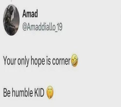 阿森納被阿瑪?shù)伦プ×恕鞍驯?。他在社交媒體上回復(fù)一位賽前豪言“阿森納4-0贏了我已拿到劇本”的球迷:“你的唯一希望就是角球”“低調(diào)點(diǎn)吧,小子”,并曬出3-2終局比分截圖配文:“享受去吧,臭小子”。
