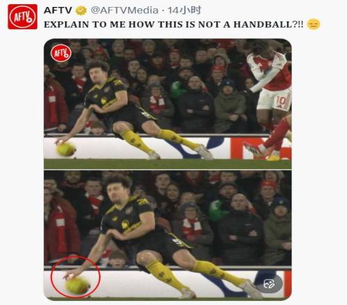 “給我解釋一下這怎么就不是手球,”Arsenal Fan TV 在社媒上寫道,并配上了球擊中馬奎爾手臂的定格畫面。