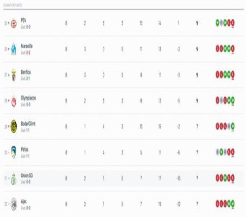 歐冠末輪半場后積分榜:曼城頂替切爾西進入前8,皇馬第5巴薩第13