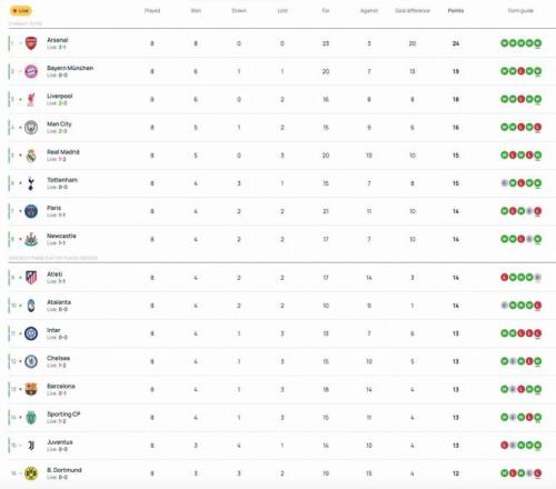 歐冠末輪半場(chǎng)后積分榜:曼城頂替切爾西進(jìn)入前8,皇馬第5巴薩第13