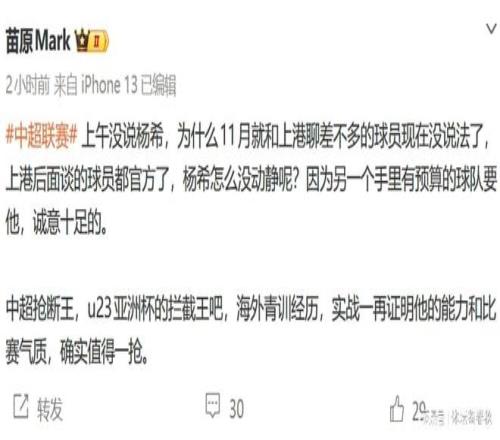 近日,知名體育媒體人苗原發(fā)文表示,有一支手里有預(yù)算的中超球隊(duì)正在全力追逐楊希,而且態(tài)度相當(dāng)明確,不是試探,而是要直接簽下這位20歲的希望之星。另外,苗原還提到,楊希其實(shí)在去年11月就和上海海港聊得差不多了,當(dāng)時(shí)大家普遍認(rèn)為這筆交易只剩下了時(shí)間問題。