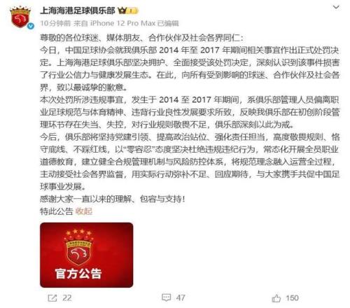 在罰單公布之后,上海申花率先發(fā)聲,在俱樂部官方社交賬號發(fā)布公告。申花稱,俱樂部尊重并接受足協(xié)的處罰決定,并強調(diào)處罰所涉及的案件均發(fā)生在俱樂部股改之前,是原股東管理運營期間的歷史遺留問題。申花表示,俱樂部將深刻汲取前車之鑒,用實際行動回應大家的期待。