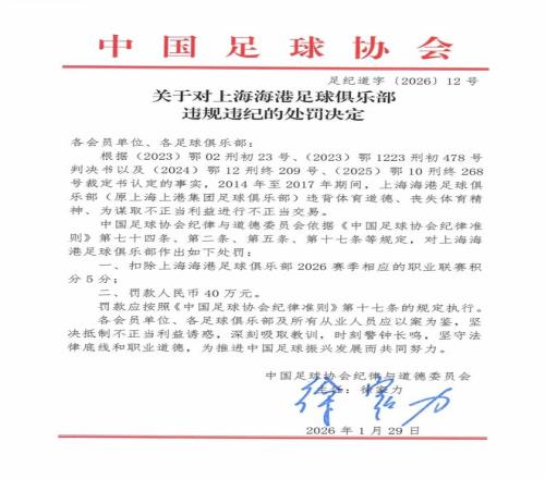今天中午,中國足協(xié)官網(wǎng)發(fā)布《中國足球協(xié)會關于對有關涉案俱樂部及人員行業(yè)處罰情況的通報》,公布對涉案俱樂部的處罰決定。罰單明確,上海申花在2015年至2021年期間,違背體育道德、喪失體育精神、為謀取不當利益進行不當交易。因此足協(xié)依據(jù)紀律準則相關規(guī)定,對申花處以扣除2026賽季聯(lián)賽積分10分、罰款100萬的處罰。