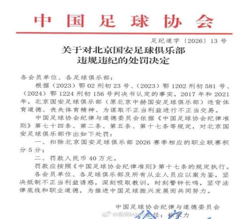 周四,中國(guó)足協(xié)正式公布受處罰俱樂(lè)部名單。北京國(guó)安被罰5分、罰款40萬(wàn),博主清蒸樹袋熊質(zhì)疑道,“咱不能揣著明白...